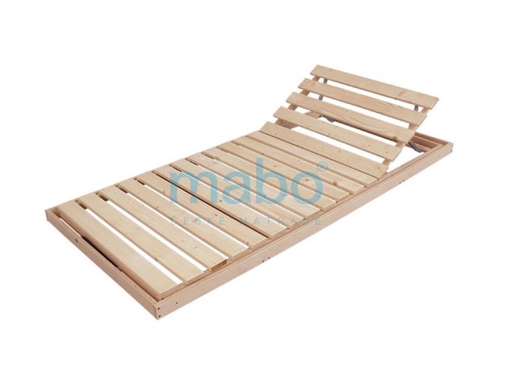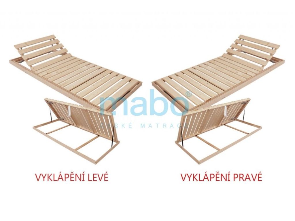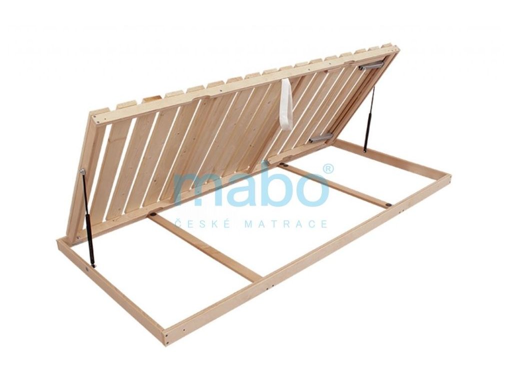 Pevný laťový rošt v rámu s bočním výklopem pro úložný prostor s polohováním hlavy. Velmi kvalitní a odolný rošt s vysokou nosností s latěmi z masivního dřeva vhodný pro všechny typy matrací. Konstrukce roštu umožňuje cirkulaci vzduchu ze spodní strany matrace. Tento rošt doporučujeme pro všechny matrace s výškou nad 20 cm, které díky své výšce nepotřebují pružnou podložku. Výhodou je také dostatečná pevnost a stabilita podložky. Rošty se vyrábějí o 1 cm užší a 4 cm kratší, takže skutečný rozměr roštu pro matraci 90 x 200 cm je 89 x 196 cm. Atypické rozměry připravíme na vyžádání.