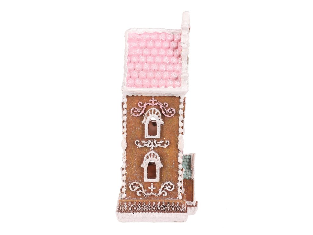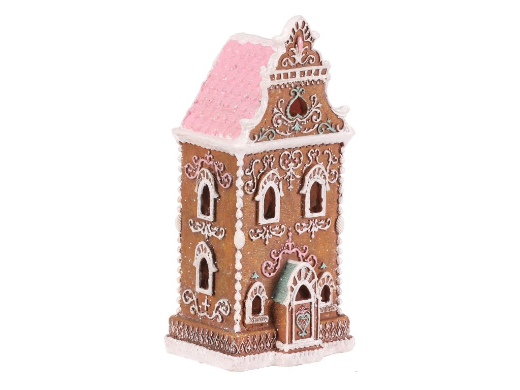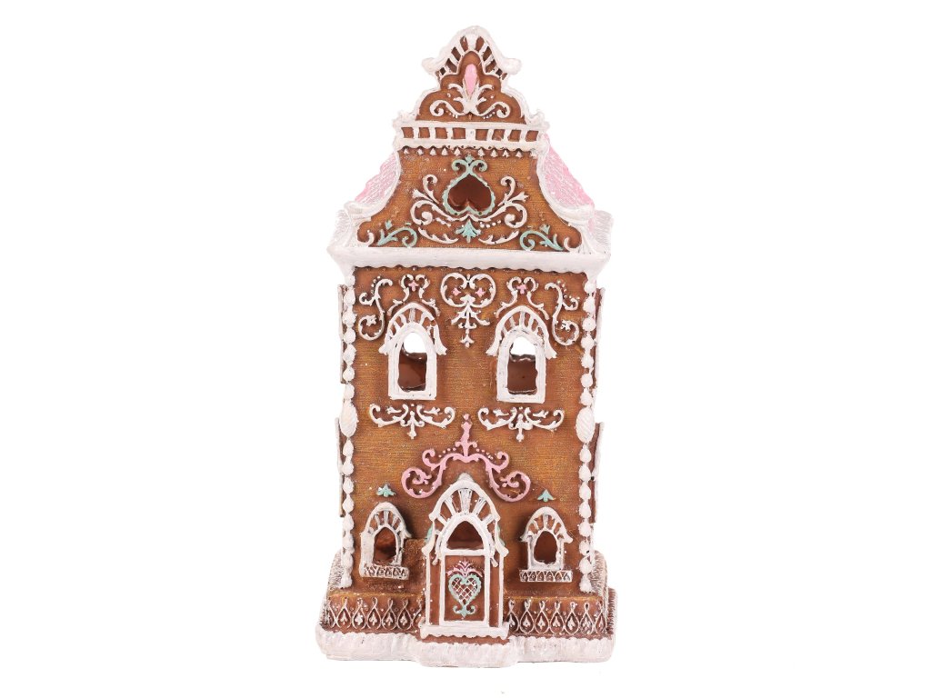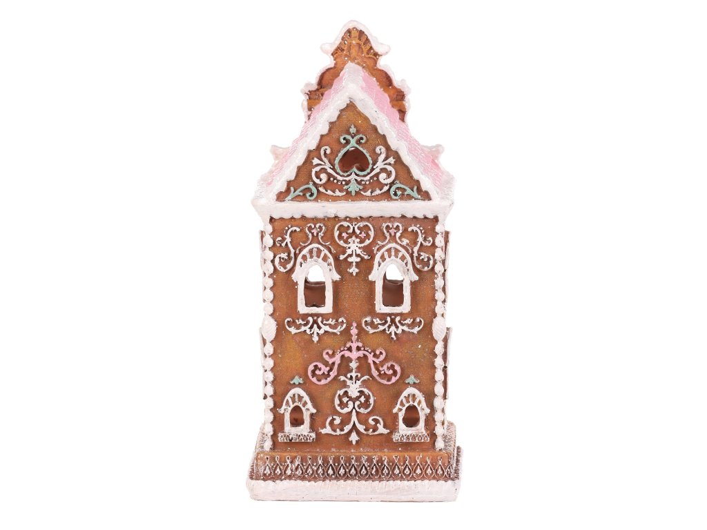 Polyresinová stolní dekorace, v podobě zdobeného patrového domku v perníkovém designu, bude nádhernou dekorací pro kouzelné vánoční období. Vypadá jako by byl skutečně vytvořen z perníku a ozdoben sladkou barevnou polevou. To ale ještě není vše! Díky zabudovanému LED osvětlení uvnitř, si můžete po jeho rozsvícení vychutnávat pohled na nádherně rozptýlené paprsky, které vycházejí skrze všechna okénka ven.