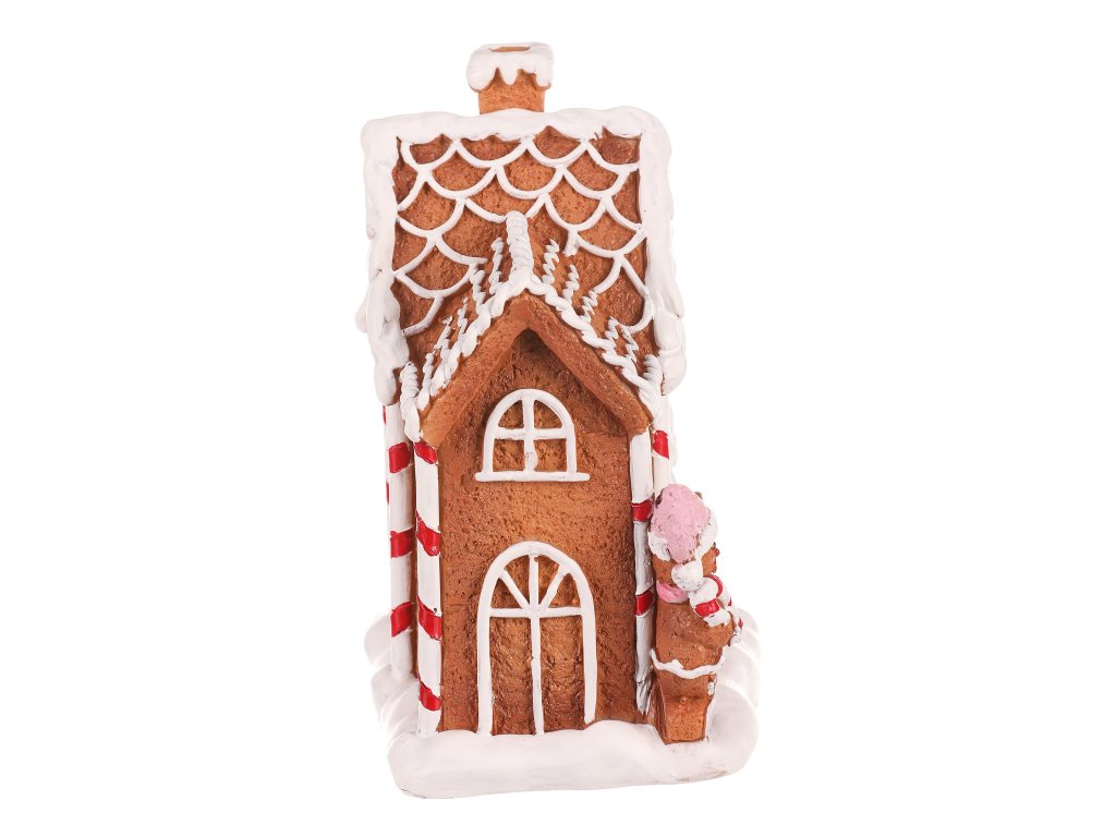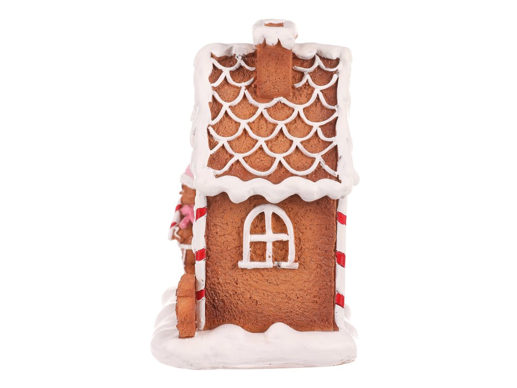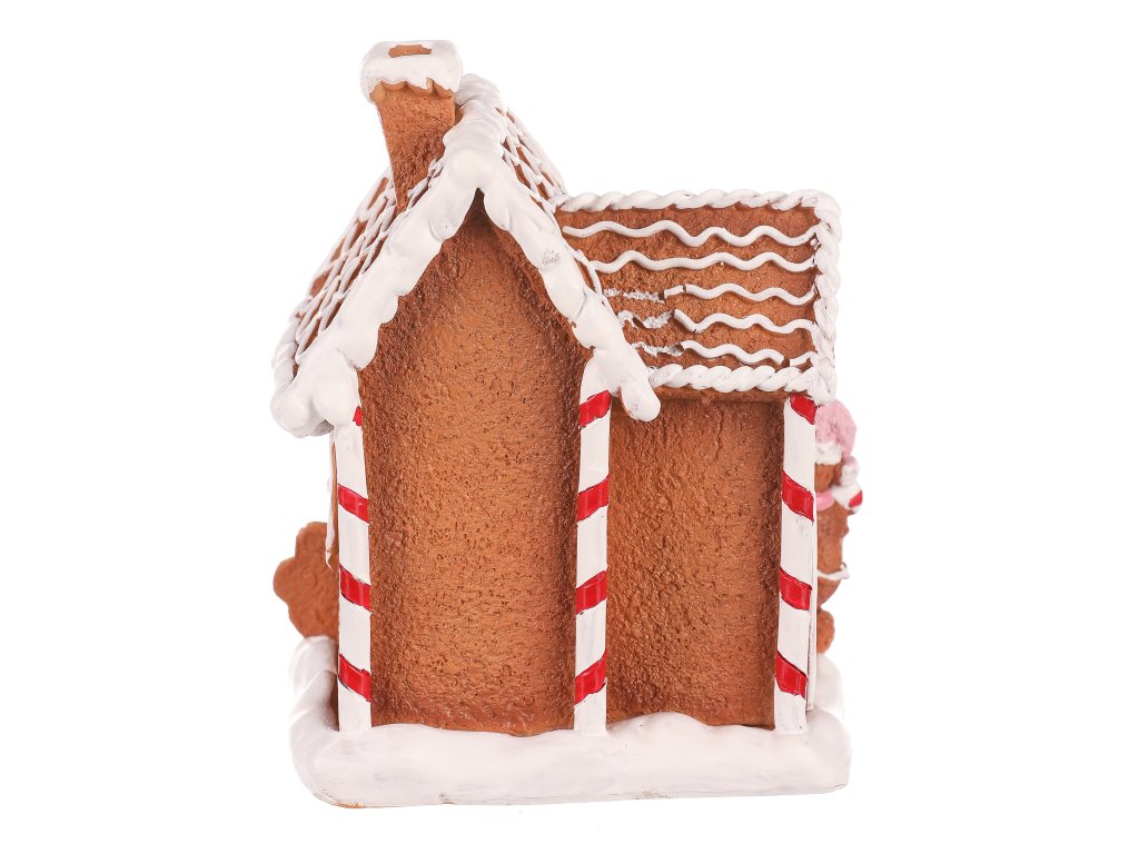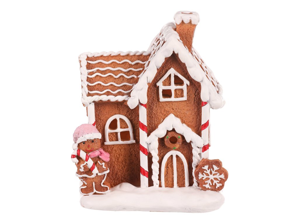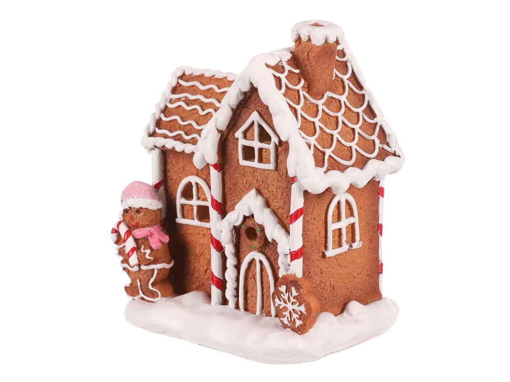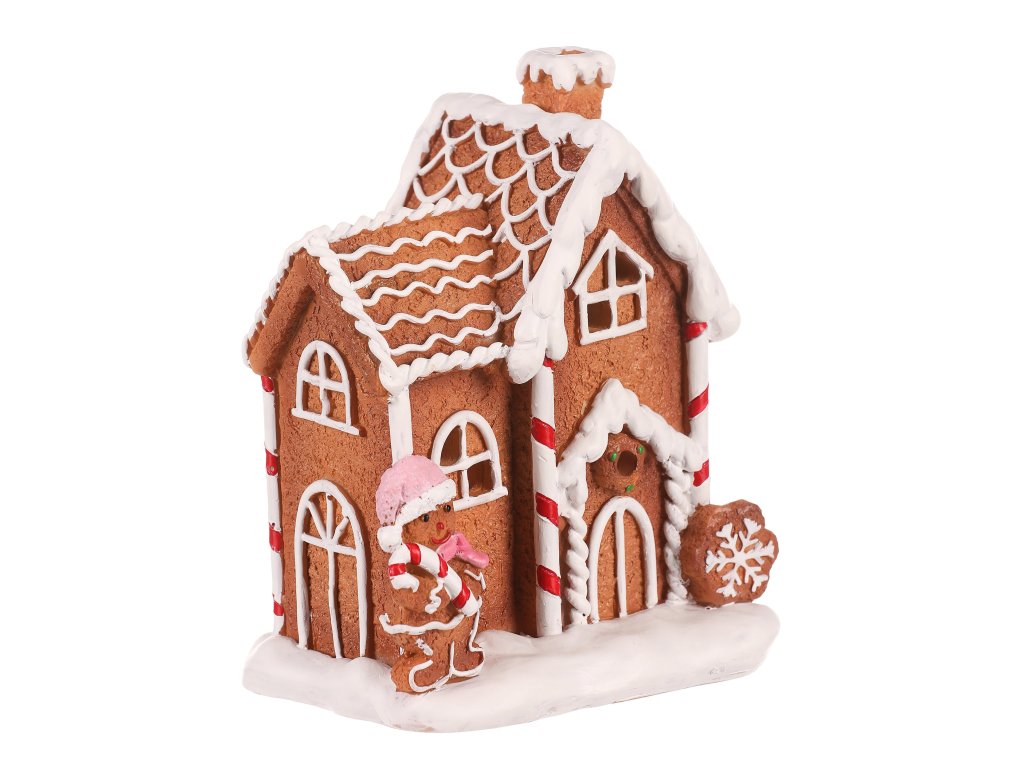 Dekorace z perníku patří k nejtypičtějším a nejkrásnějším ozdobám využívaným pro vánoční čas. Tento nádherně zdobený perníkový domeček z polyresinu, doplněný LED osvětlením uvnitř, bude skvělou volbou pro ozdobení poliček, stolů a dalších viditelných míst. Vypadá jako cukrářské mistrovské dílo, které umožňuje vytvořit neodolatelný světelný efekt díky pronikajícím paprskům světla skrze okénka, dvířka a komínek.