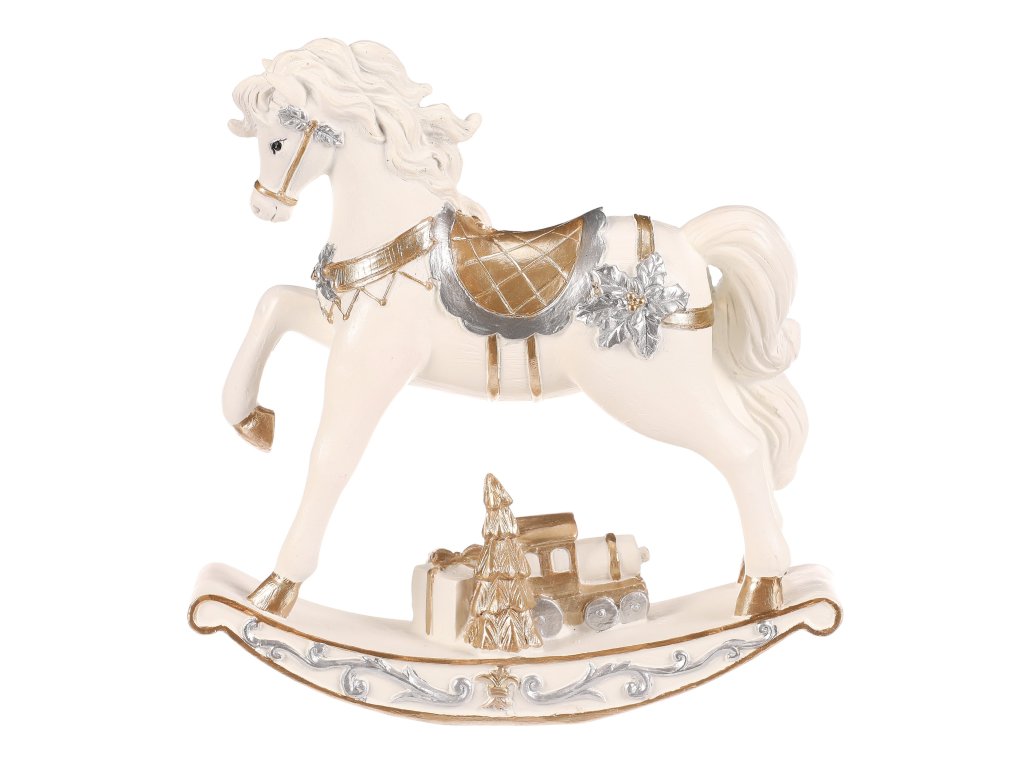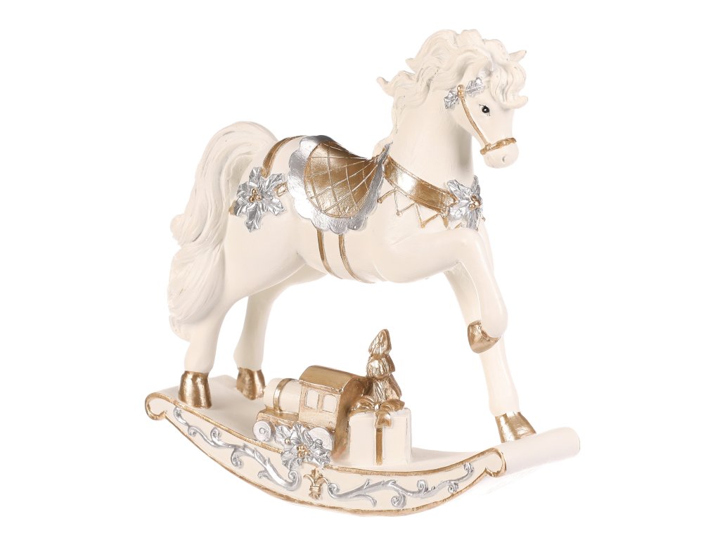 Houpací koník v tomto malebném, až slavnostním provedení přináší kouzlo sváteční atmosféry s puncem starých časů. Precizně zdobená světle krémová figurka z polyresinu s jemnými zlatými i stříbrnými detaily a dárkem na podstavci působí svátečně a velmi elegantně. Jedná se tak o skvělý doplněk vánoční výzdoby.