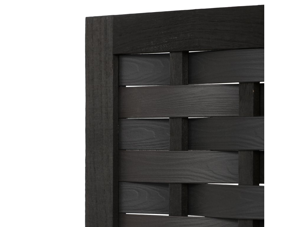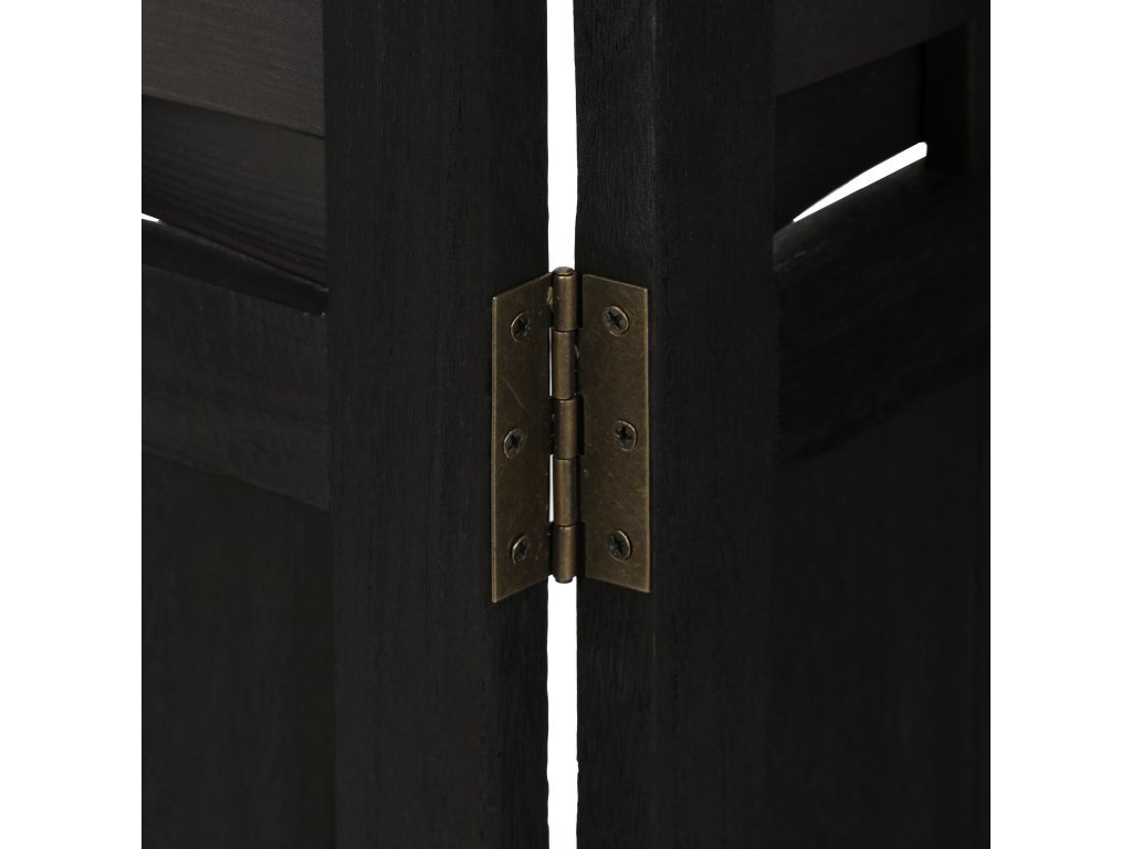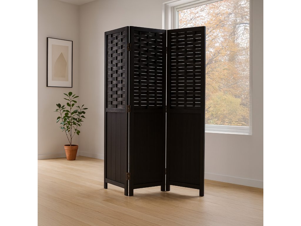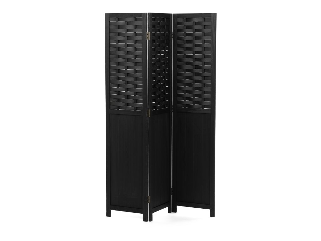 Třídílný paraván z masivního smrkového dřeva v černém provedení nabízí praktické řešení pro rozdělení prostoru s výrazným přírodním dekorem. Horní část tvoří propletené lamely, které propouštějí světlo a zároveň zajišťují dostatečnou míru soukromí, spodní část je tvořena plnou deskou s viditelnou strukturou dřeva. Pevné panty umožňují snadné skládání a přizpůsobení úhlu rozložení podle potřeby. Povrchová úprava v černé barvě podtrhuje výraznou texturu dřeva a usnadňuje údržbu. Paraván je vhodný pro použití v interiérech, kde je potřeba opticky oddělit části místnosti nebo vytvořit dekorativní prvek.