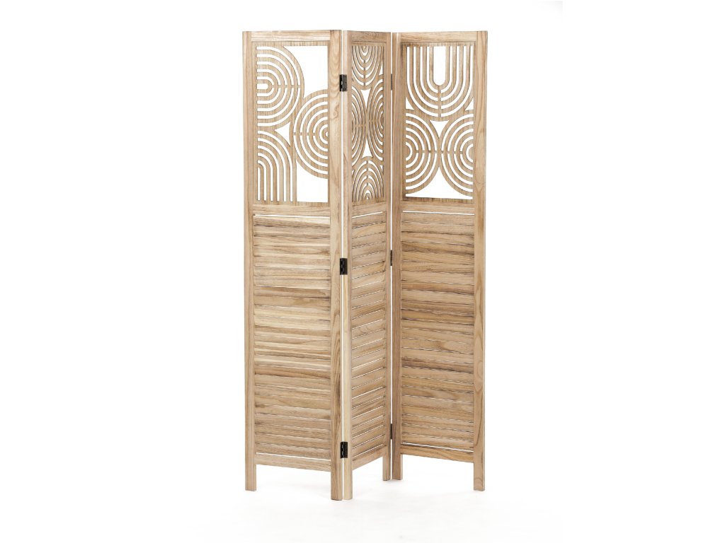 Třídílný dřevěný paraván z masivu smrku v přírodním odstínu kombinuje pevné provedení s dekorativní perforací horní části, která vytváří zajímavý vizuální efekt. Každá část je spojena kovovými panty umožňujícími flexibilní nastavení úhlu a snadné přenášení či skladování. Paraván slouží jako praktický prvek pro rozdělení prostoru nebo zvýšení soukromí v interiéru, přičemž přírodní dřevěný dekor přináší do místnosti teplý a přirozený vzhled. Povrch je upraven tak, aby materiál byl snadno udržovatelný a odolný vůči běžnému opotřebení. Rozměry a konstrukce zajišťují stabilitu a dlouhou životnost produktu.