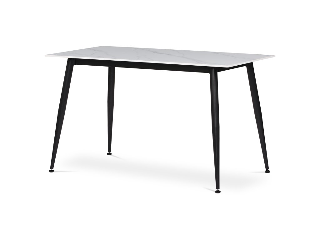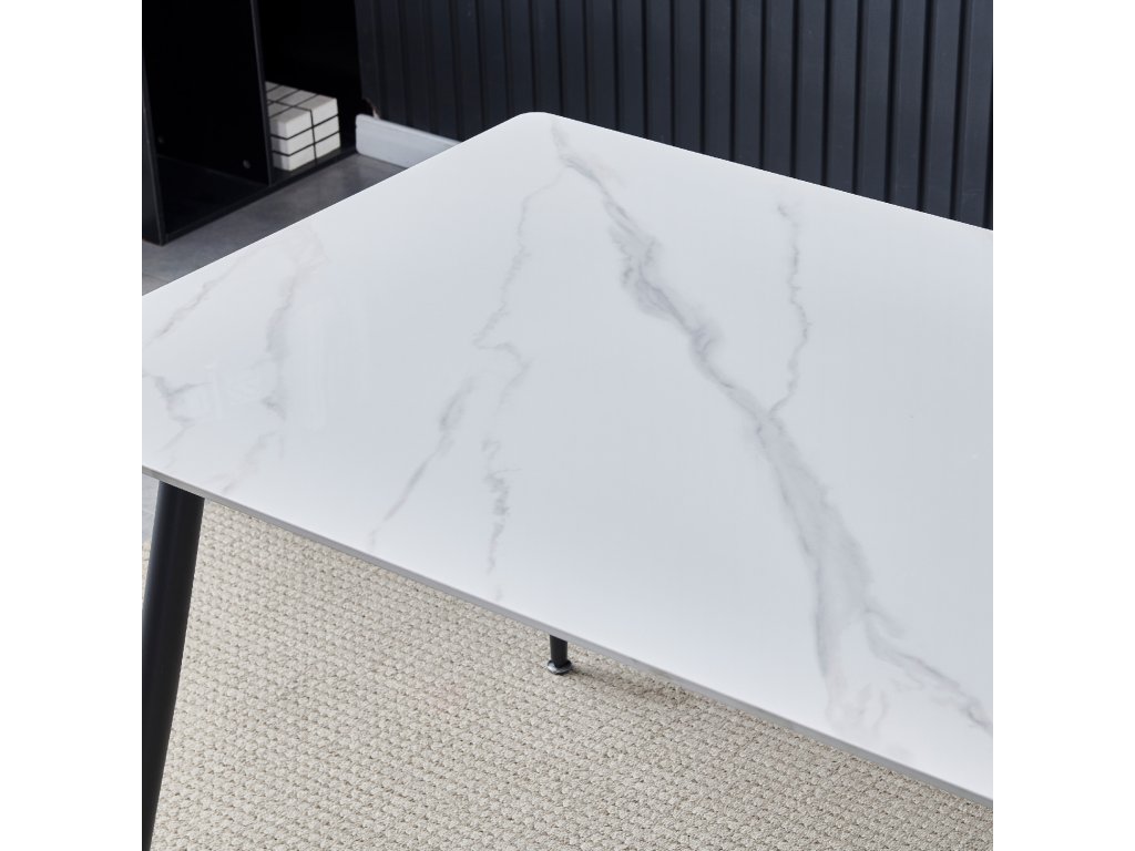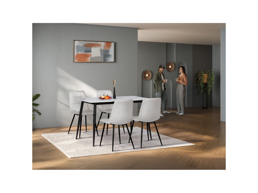 Jídelní set 1+4 kombinuje moderní design s praktickým provedením vhodným pro každodenní použití. Stůl je vybaven deskou z bílého slinutého kamene s mramorovým dekorem, která nabízí pevný a snadno udržovatelný povrch odolný proti poškrábání a teplu. Černá kovová podnož stolu zajišťuje stabilitu a dlouhou životnost. Čtyři židle jsou čalouněné bílou látkou s designovým prošitím na opěradle, které dodává celku elegantní vzhled a zároveň podporuje pohodlí při sezení. Židle mají pevné kovové nohy v černé barvě, které ladí se stolem a zaručují stabilitu. Set je ideální pro menší jídelny či kuchyňské kouty s rozměry stolu 130x80 cm.