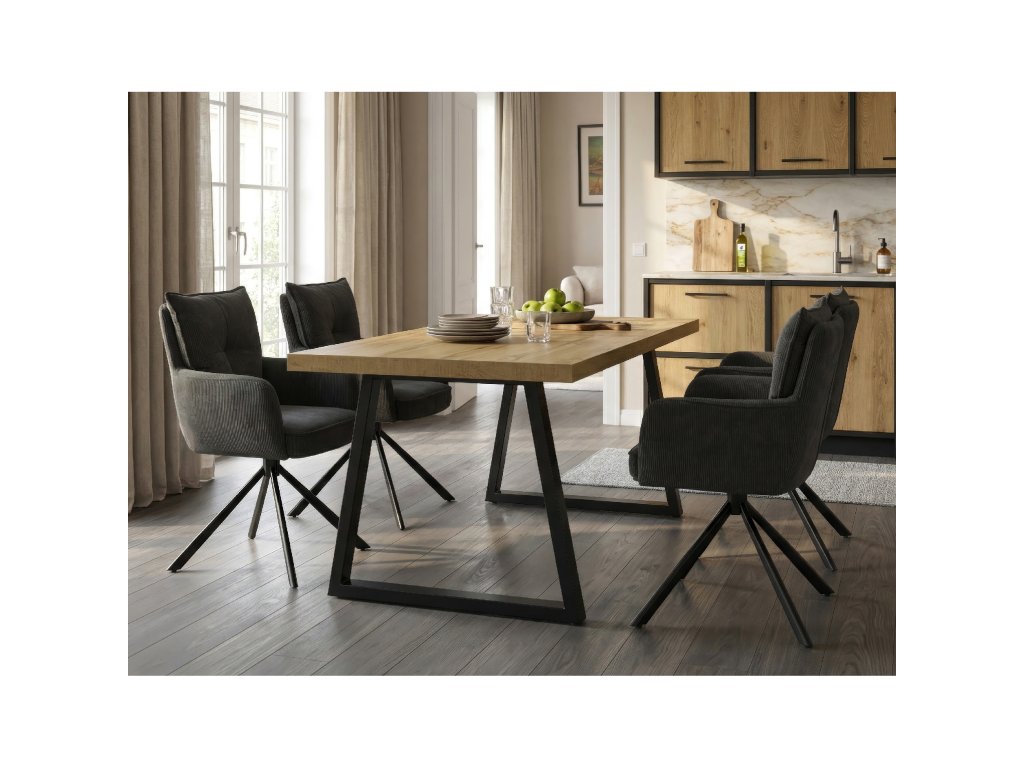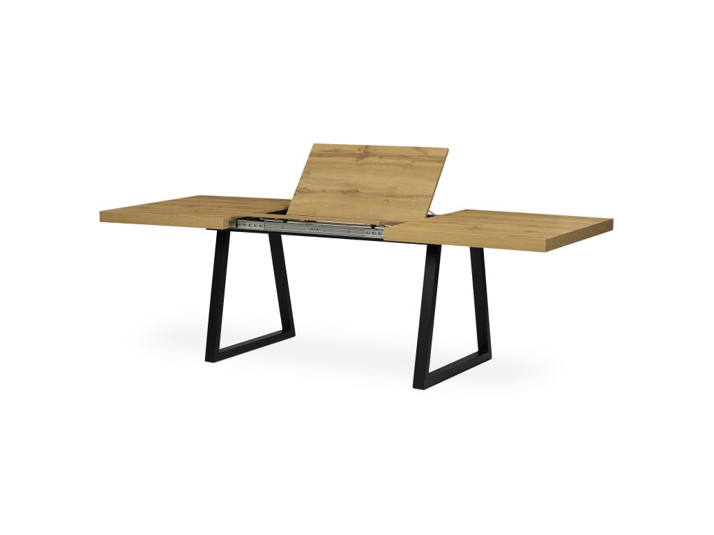 Jídelní stůl s rozkládací funkcí nabízí praktické řešení pro flexibilní uspořádání jídelního prostoru. Deska stolu je vyrobena z lamina s dubovým dekorem a matnou povrchovou úpravou, která je odolná proti poškrábání a snadno se udržuje. Hrany desky jsou opatřeny ABS lištou, která zvyšuje odolnost proti poškození a zároveň dodává stolu precizní vzhled. Stabilní kovová podnož v černé barvě zajišťuje pevnou oporu a stabilitu během používání. Rozměry 160x90 cm lze rozšířit o 80 cm, což umožňuje pohodlné usazení většího počtu osob. Výška stolu 76 cm odpovídá standardním ergonomickým parametrům pro jídelní nábytek.